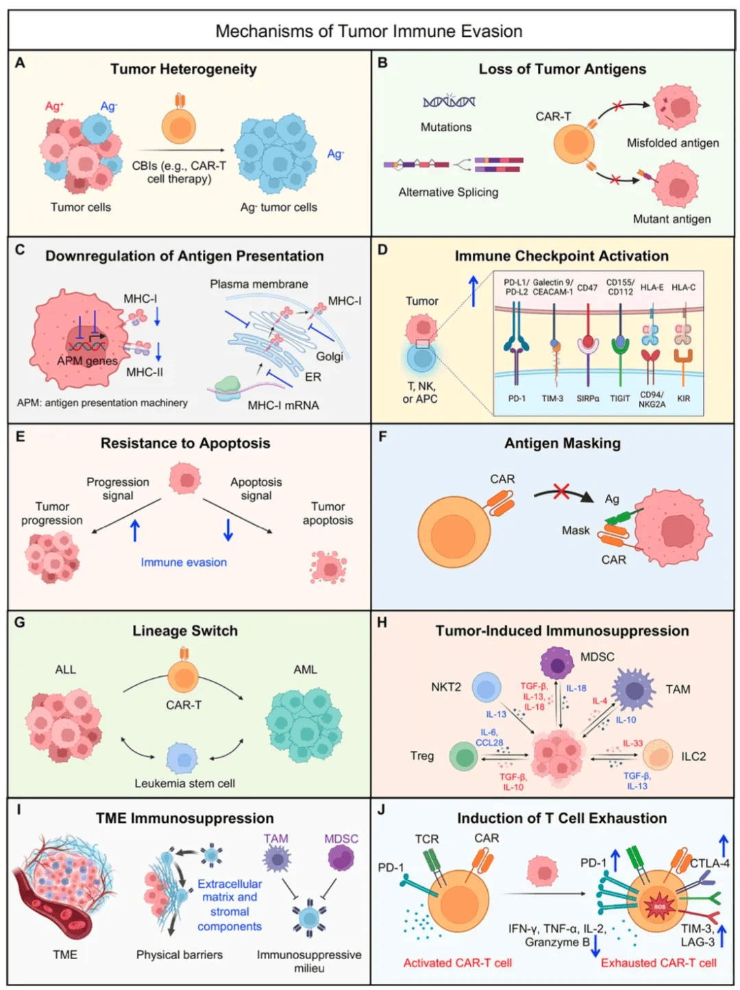 肿瘤细胞可通过基因突变或RNA选择性剪接等机制,引起肿瘤抗原的错误折叠或结构变异,导致CAR-T等免疫效应细胞难以识别相应抗原,从而实现免疫逃逸。