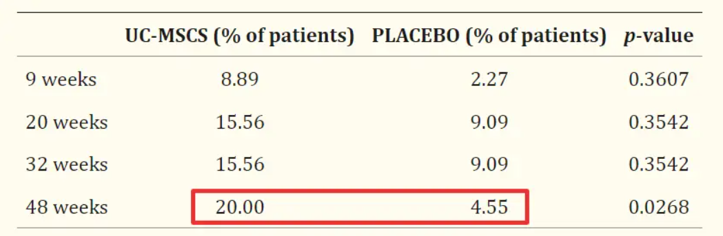 临床研究结果显示,与安慰剂组相比,人脐带间充质干细胞(UC-MSCs)组有更多的患者达到主要终点。即在干预后48周,脐带间充质干细胞(UC-MSCs)组20%的患者实现了糖化血红蛋白(HbA1c) 水平<7.0%和每日胰岛素减少≥50%的目标,而安慰剂组为4.55%(p < 0.05)如下图。