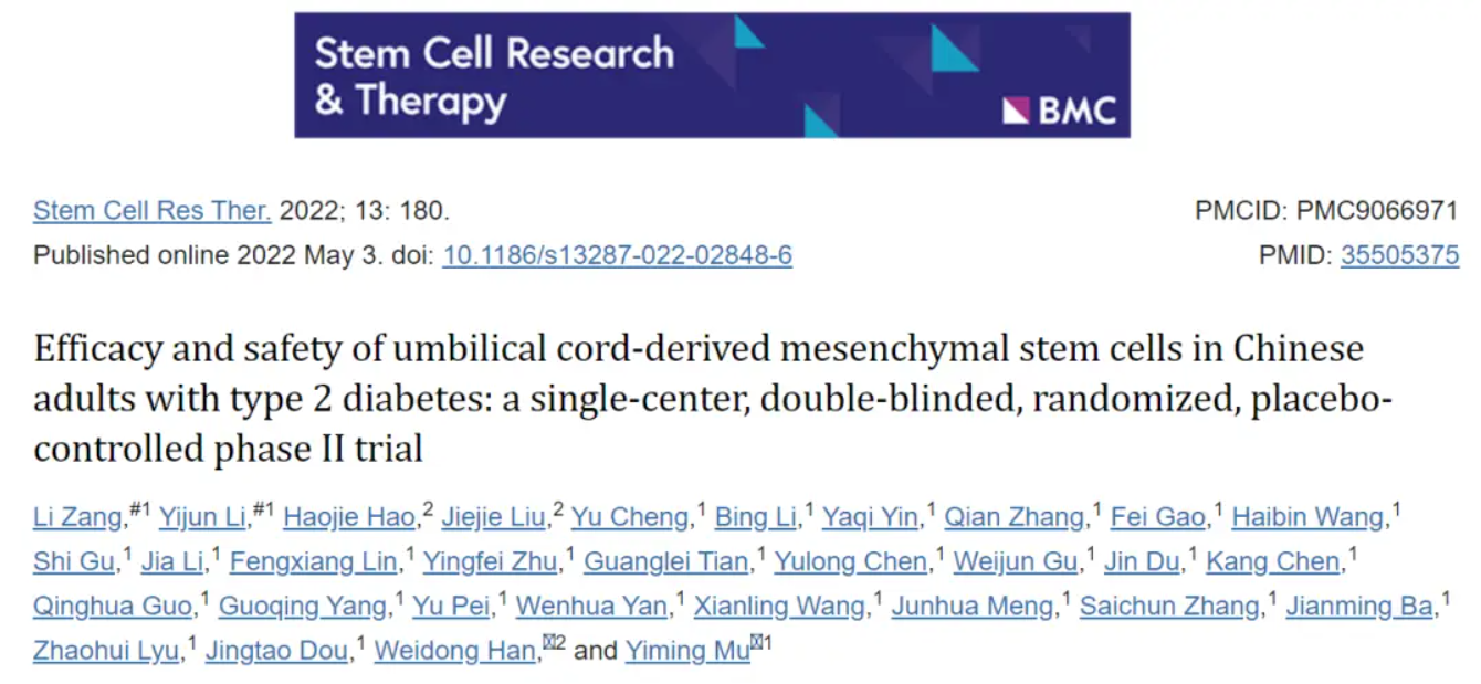 今天我们主要来看一则国内解放军总医院(301医院)对于脐带间充质干细胞临床治疗中国成人Ⅱ型糖尿病的研究试验,这项研究的结果表明:通过静脉输注给予脐带间充质干细胞(UC-MSCs)是一种安全有效的方法,可以减少外源性胰岛素需求,缓解Ⅱ型糖尿病患者的胰岛素抵抗。脐带间充质干细胞移植是Ⅱ型糖尿病的潜在治疗选择。