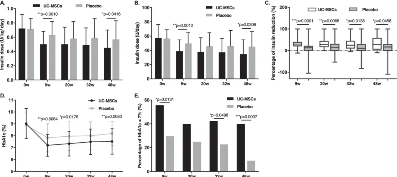人脐带间充质干细胞(UC-MSCs)输注后HbA1c水平下降,在细胞干预调理后9周观察到最大下降,在随访的20、32和48周略有上升,不过仍然低于基线值。在48周时,脐带间充质干细胞(UC-MSCs)组的HbA1c水平下降了1.31%,而对照组仅下降了0.63%(p=0.0081),这些结果表明,UC-MSCs输注调理2型糖尿病具有积极潜力。