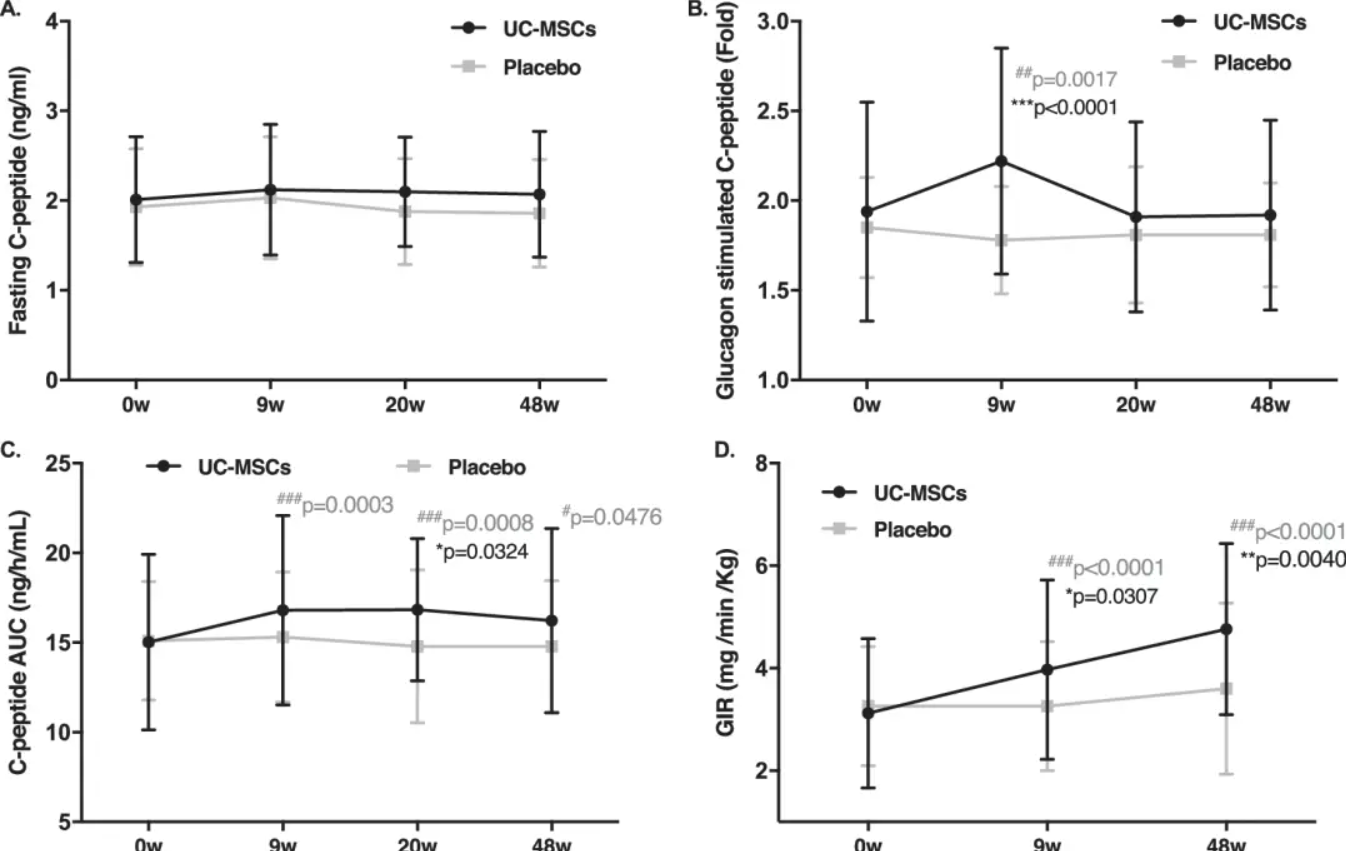 脐带间充质干细胞(UC-MSCs)组中胰高血糖素刺激的C肽水平的倍数变化在9周时增加,在20周和48周时逐渐降低,虽然最终细胞干预组的C肽水平在试验期间没有显著变化,但是安慰组的C肽水平在试验期间一直在持续下降。