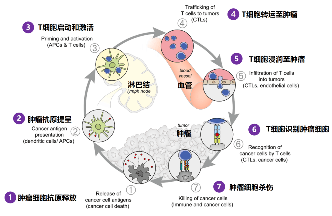 结合下图我们来介绍T细胞介导的抗肿瘤免疫应答过程,从肿瘤细胞抗原释放到最终杀伤肿瘤细胞的一系列关键步骤。